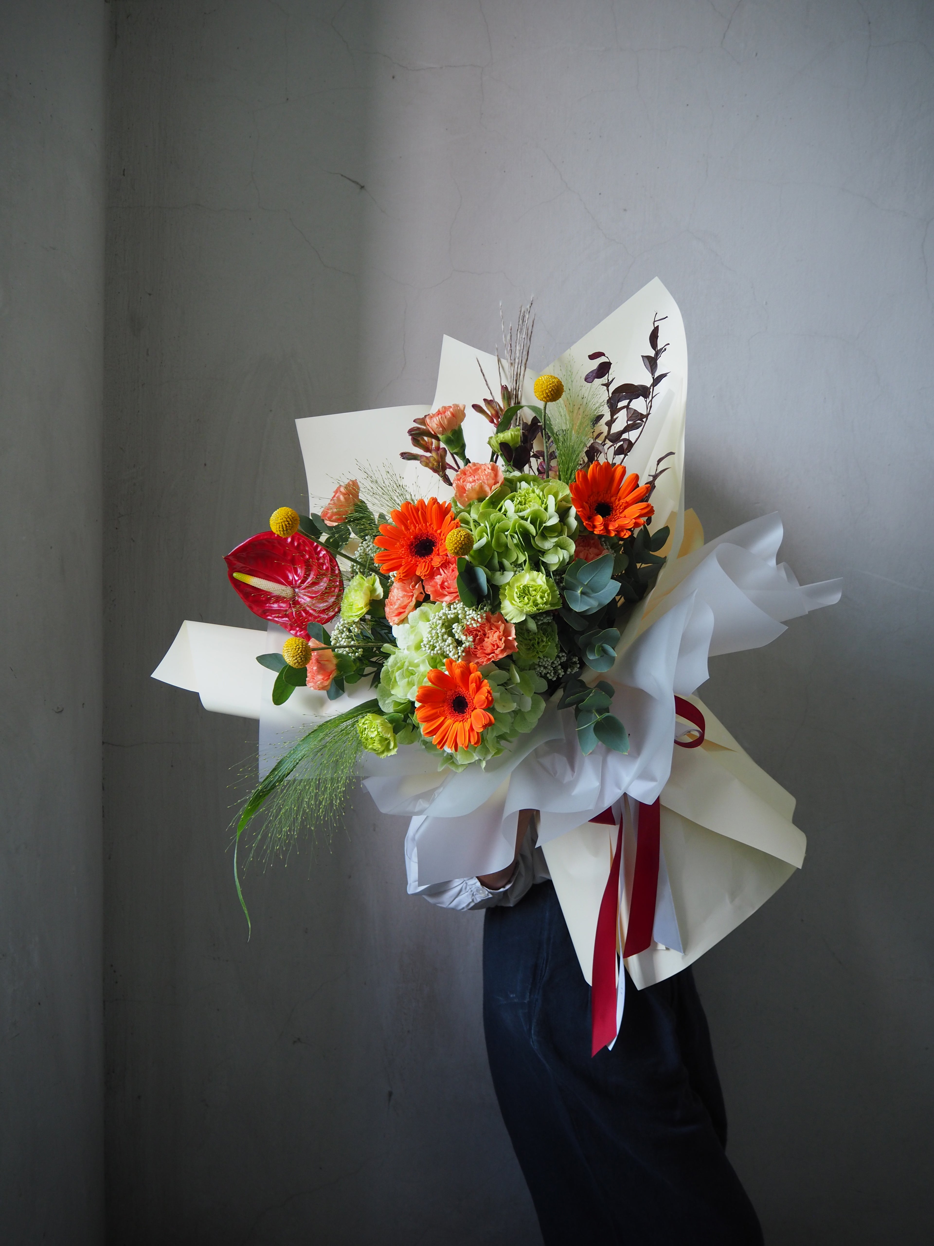 Gardenia unfolds like a royal stroll through Jardin du Luxembourg. Verdant hydrangeas form a lush base, while sunlit gerberas, fiery anthuriums, and golden billy buttons dance in radiant harmony. Bold, confident, and impossibly elegant, this bouquet captures Parisian grandeur.