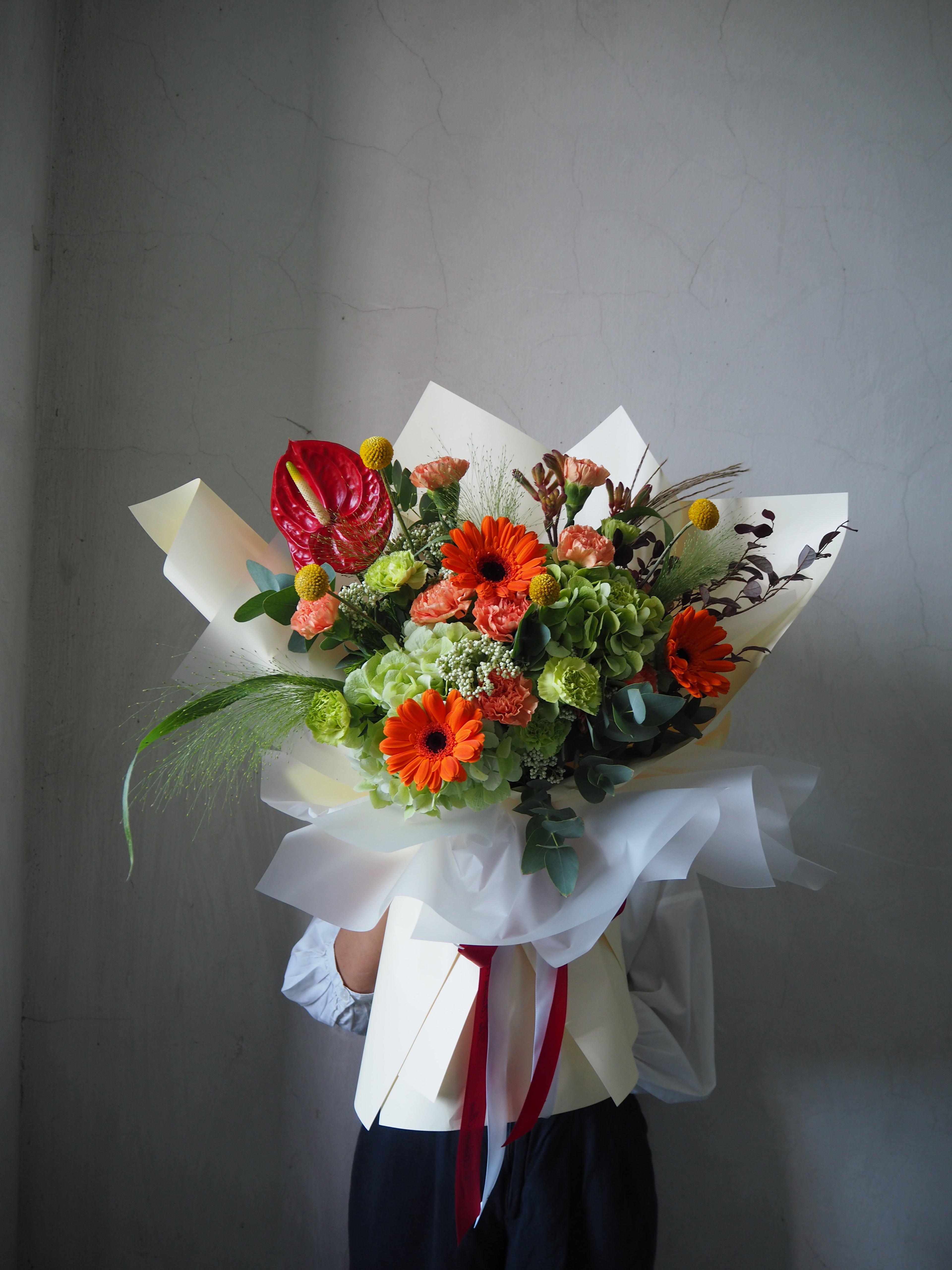 Gardenia unfolds like a royal stroll through Jardin du Luxembourg. Verdant hydrangeas form a lush base, while sunlit gerberas, fiery anthuriums, and golden billy buttons dance in radiant harmony. Bold, confident, and impossibly elegant, this bouquet captures Parisian grandeur.